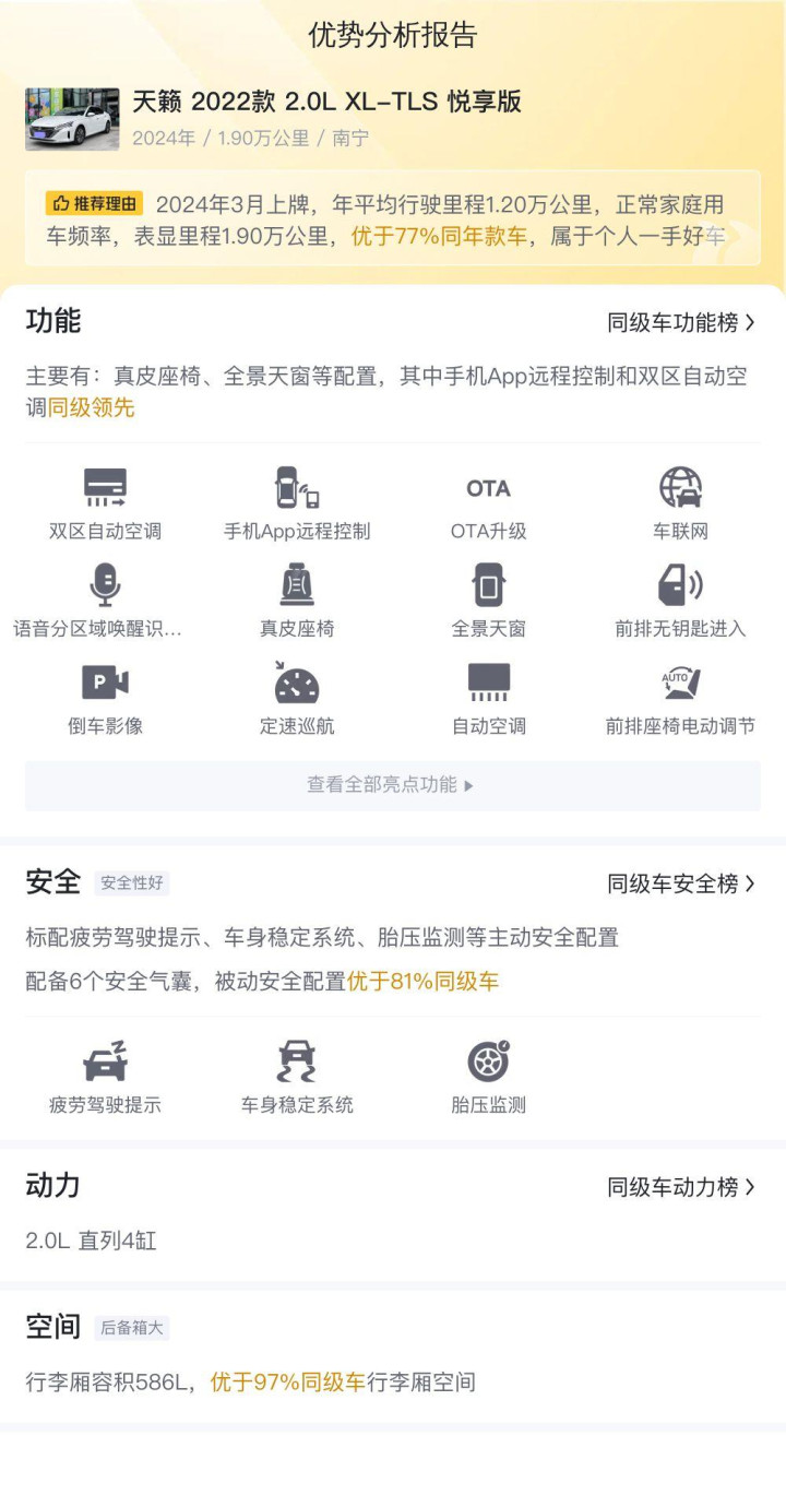 天籁 2022款 2.0L XL-TLS 悦享版的市场行情价是10.74万-12.88万,它的报价则是11.68万,所以报价在市场行情中偏高。但是它的保值率较高,因为它的保值率与同级车相比,处于较高的位置。而且买二手车,车况永远是排在第一位的,这辆车已经通过了事故检测、火烧检测和泡水检测,可以确定它非重大事故车、非火烧车、非泡水车,所以基本不用担心安全部问题。
